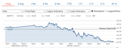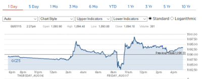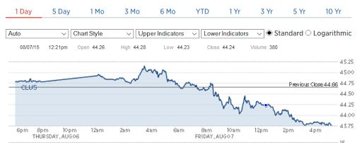 Oil ended down $0.79 today for a final price of $43.75 or 1.77% below Thursday’s closing price. The 1.77% drop was due to mounting concerns over a growing surplus in fuel as summer comes to a close. In addition six oil rigs were added this week by United States energy firms for the third straight weekly increase. This is despite the massive slump in oil prices driven by Saudi Arabia and the United States refusing to cut production as well as Iran’s potential entrance into the marketplace as international sanctions may be lifted.